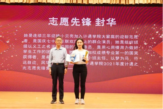 计1704志愿委员、计2003学生班主任、计通学院组织部部长助理,计科专业第一、特奖选手,优秀共青团干部、社会实践先进个人,参与国庆联欢、阳光晨跑、橙暖校园、连续三年迎新,累计获得306.5个工时