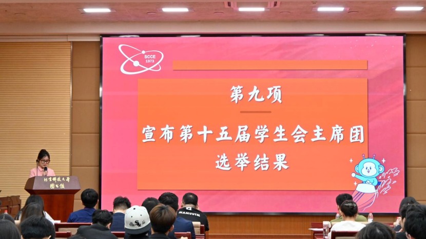 现任学生会主席团成员雷振原宣读选举监选组名单,为后续公正、有序的选举工作筑牢基础。随后,总监票人王子涵接过主持棒,引领大会进入选举关键环节。与会代表认真听取并审议《北京科技大学大学计算机与通信工程学院第十五次学生代表大会选举办法(草案)》,经大会全体审议通过后,李菲同志宣读计通学院第十五届主席团候选人名单,他们即将在竞选舞台上展现风采。