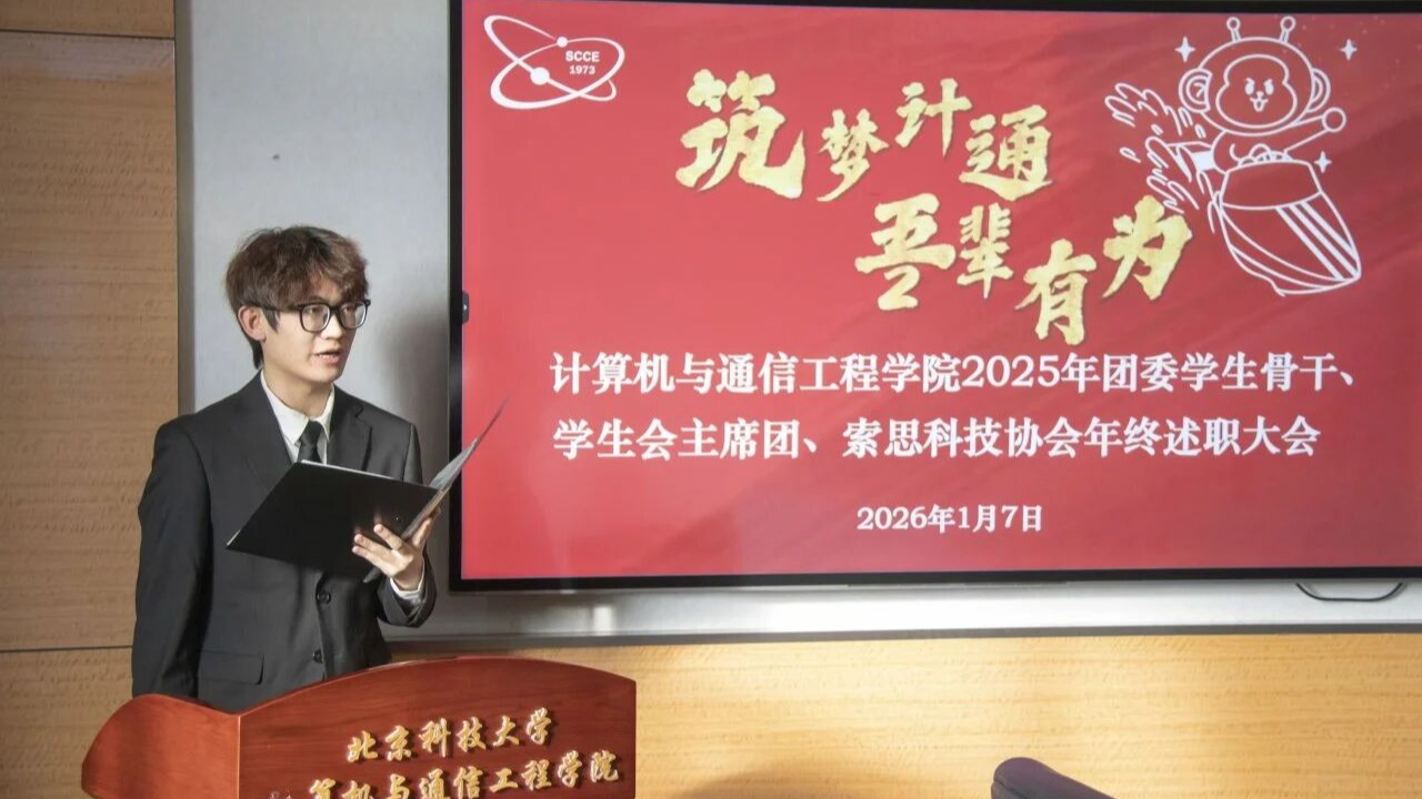 2026年1月7日,北京科技大学计算机与通信工程学院2025年团委学生骨干、学生会主席团、索思科技协会年终述职大会在机电楼601圆满召开。计算机与通信工程学院团委书记傅泓源,团学指导老师、学院辅导员刘忠鑫、张振亚、马瑶、孙天乐、苏月、胡晗明、史涵博出席本次会议。计通学院第十五届团委、学生会各部门代表参与。
