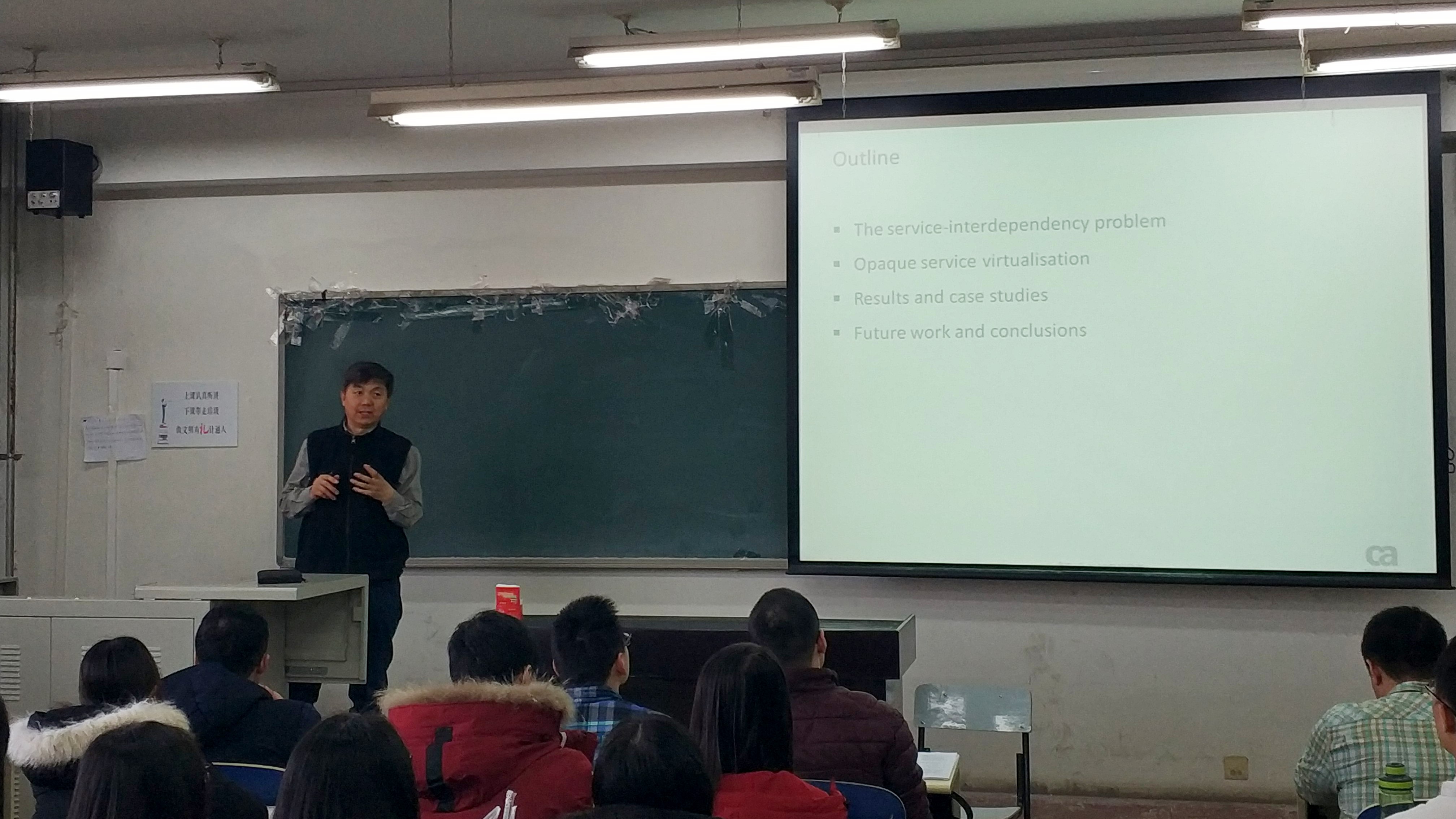 在报告中,韩教授指出待测系统与其他的软件服务之间存在相互依赖关系,如何提供与待测系统的运行环境类似的测试环境是一项挑战。针对该问题,韩教授团队提出了一种软件模拟软件的方法,该方法不需要预先知道使用的服务协议,而是首先记录服务交互的信息,根据消息的类型进行分类,然后使用“Multiple Sequence Alignment”算法获取不同类型的消息模板,运行时通过将请求消息与消息模板匹配,产生对应的响应消息。实验结果表明该方法是可行的,产生的响应消息类型的正确性高达99%。报告结束后,同学们踊跃提出问题,韩教授一一为同学们解答。