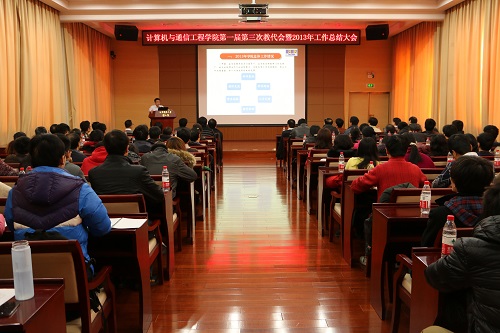 12月31日下午,计算机与通信工程学院第一届第三次教代会暨2013年工作总结大会在图书馆报告厅成功举行。副校长权良柱、校工会常务副主席贾水库和学院党政领导班子成员出席会议,学院教职员工和学生代表120余人参加会议...